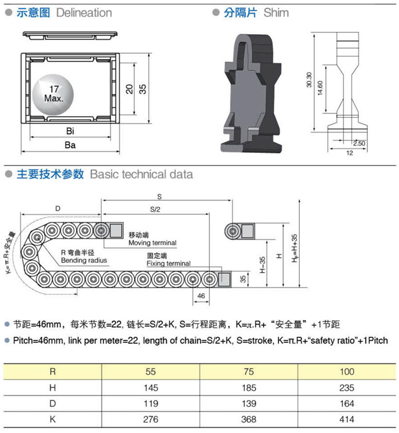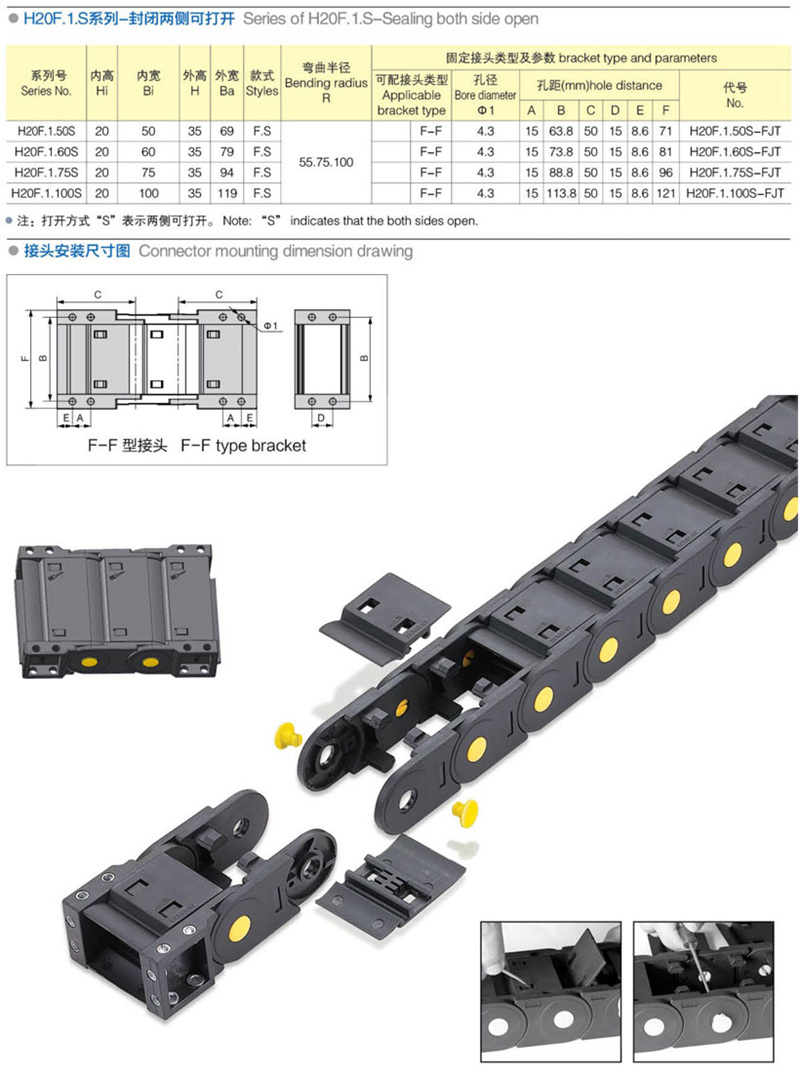 名稱(chēng):拖鏈 材質:塑料 分類:中型係列 係(xì)列號: H20F.1.S 長度: 22pitch/m 內高: 20mm 內寬: 50-125mm 彎曲半徑: 55 75 100 應用機械:全部