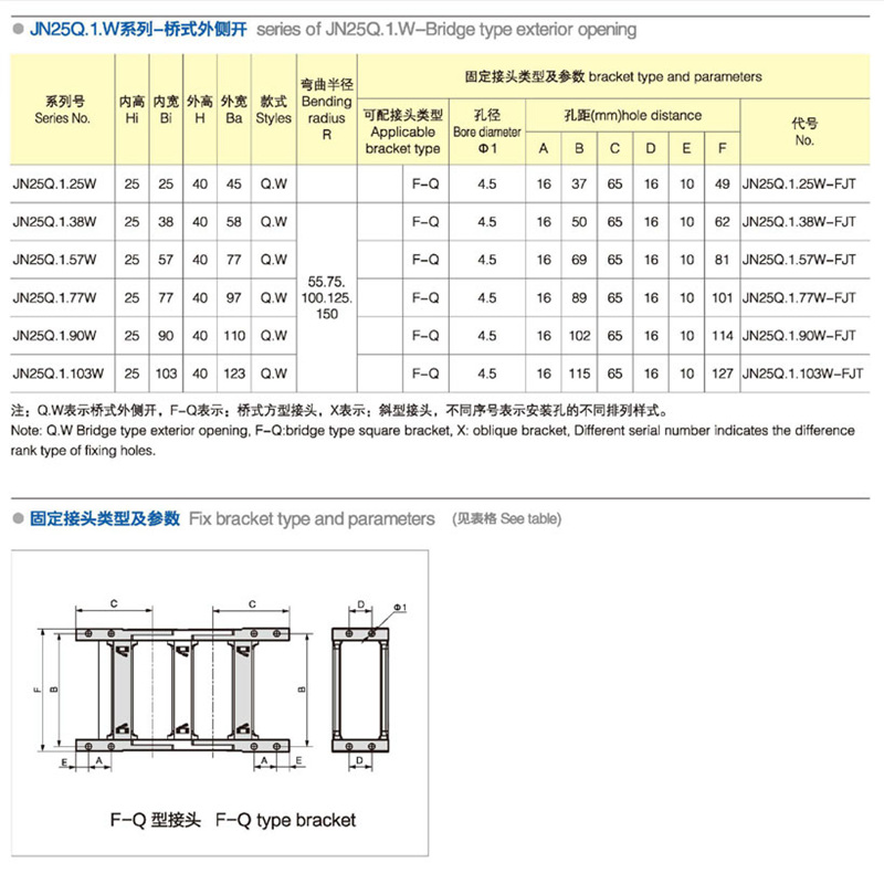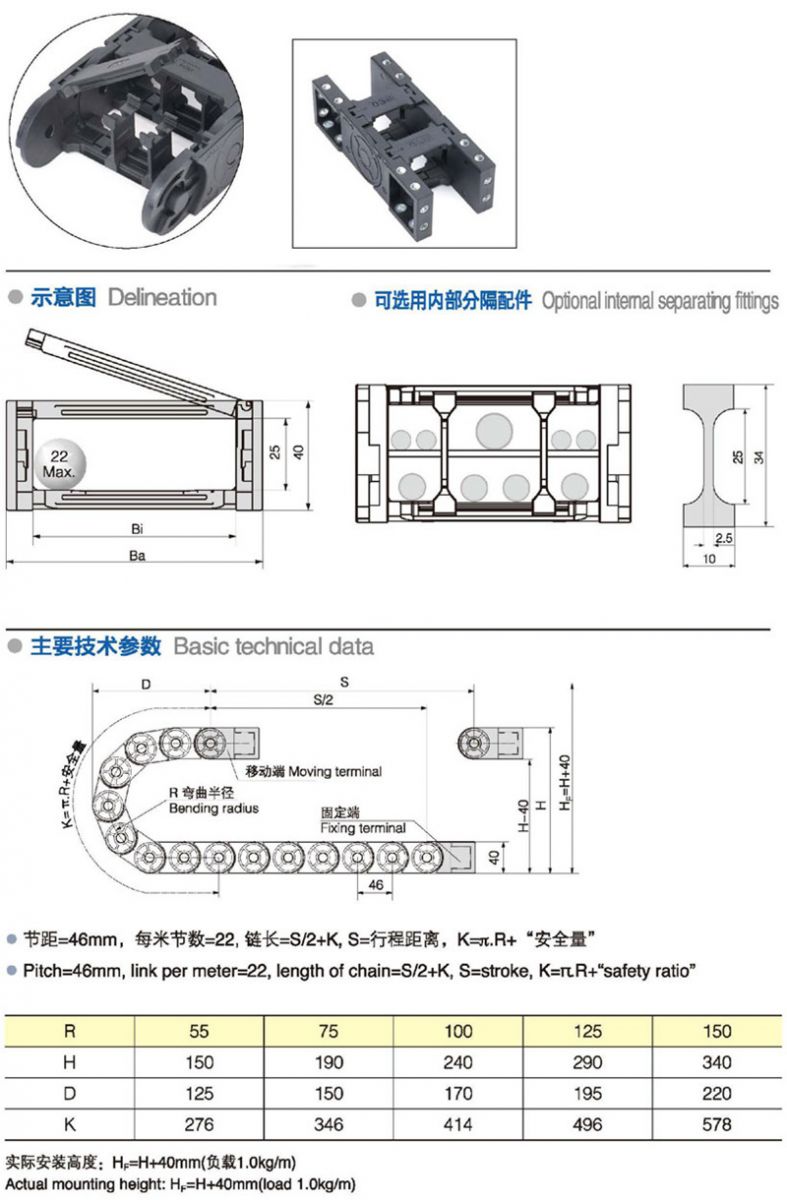 名稱:拖(tuō)鏈 材質:塑料 係列號:JN25Q.1.W 長度:22pitch/m內高:25mm 內寬:25-50mm 彎曲半(bàn)徑:5575100125150 應用機械:全部
