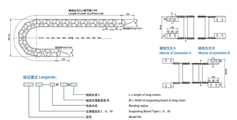 拖鏈型號(hào)TL95,支撐板Ⅲ型,彎曲半徑R=250,支撐板寬度Bi=300,拖鏈長度L=7500