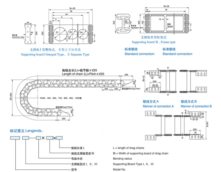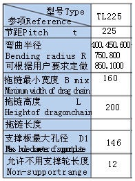 拖鏈型號TL225,支撐板Ⅲ型,彎曲半徑R=600,支撐(chēng)板寬度Bi=400,拖鏈長(zhǎng)度L=12000